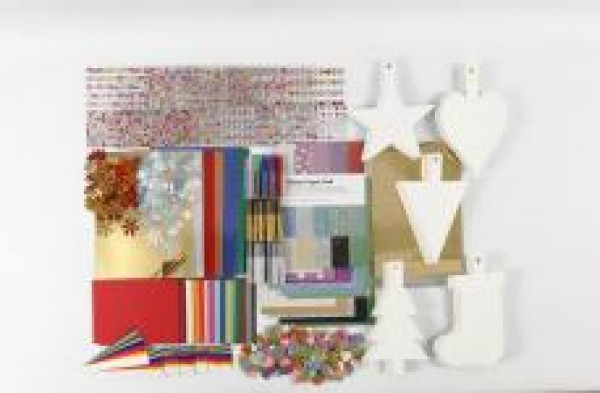 Inhalt: 120 Blatt Karton, 30 Blatt Metallic-Karton, 24 x Glitzerkleber in verschiedenen Farben, 20 Blatt Gold- und Silberpapier, 100 weiße Weihnachtskarten, selbstklebende Strassteine, 400 Papierstreifen, funkelnde Figuren aus Moosgummi.