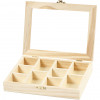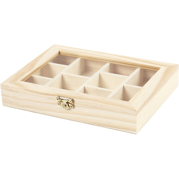 Wooden box with glass lid and metal lock, divided into 10 compartments of 2 sizes.