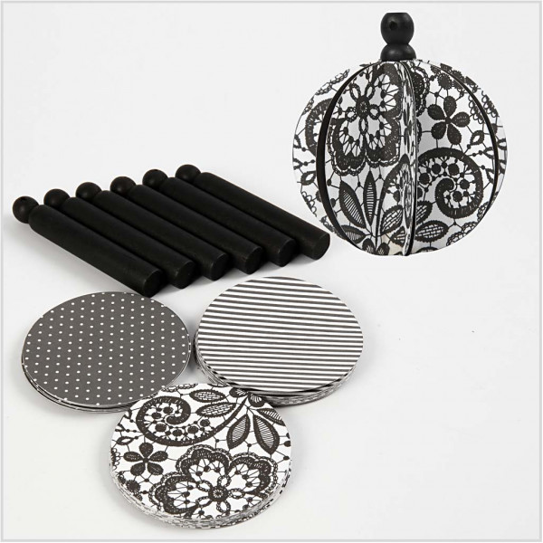 Packung mit 48 Kreisen in 3 verschiedenen Designs á 2 St. und 6 St. Wäscheklammern zum Montieren. Anleitung wird mitgeliefert.