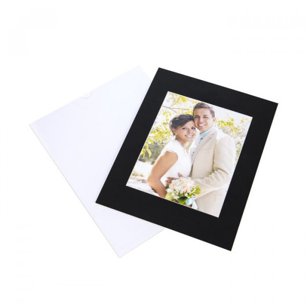 Do you have a photo or piece of artwork that you want to show off? Check out our line of Slip-in Mats today for high quality presentation mats at affordable prices. This 279 x 356mm mat is rich black in color and has a white paper core. Made with Crescent® 4-ply mat board, this mat is buffered, pH neutral. MS40004 features a 191 x 241mm opening and a 45 degree bevel-cut. Load photos with easy with a thumb notch design. Top loading.