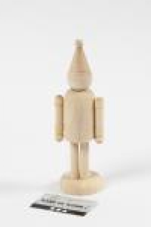 Figure in bright wood with nice details and moving arms. Mounted on foot so the figure can stand.