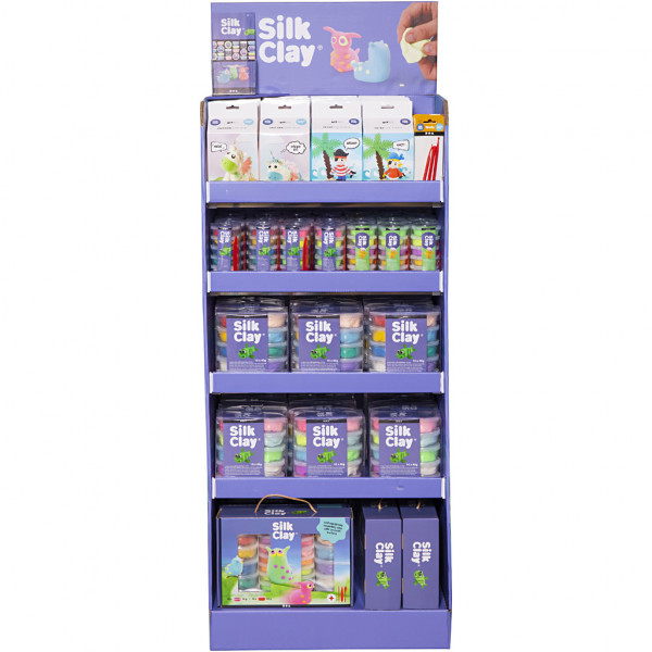 Content: 1 pcs. floor display, 24 sets of Funny Friends, 20 pack of tool, 28 tubes with Silk Clay in 14g buckets, 2x12 pack Silk Clay in 40g buckets and 6 gift boxes and brochure holder. Assembly instructions included.