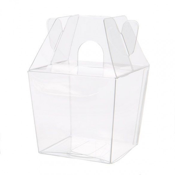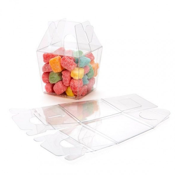 The design of this mini takeout box creates an adorable display for treats and favors. The FS282 box measures 60 x 51 x 54 mm and comes in a clear for a unique look. Package candy, cookies, crafts, jewelry, and gifts. This box will hold two mini macaron cookies and is perfect for favors. The gable-top style and die-cut handle offer an eye-catching presentation. The semi-transparent material offers a classy look and is 300 micron thick for outstanding durability. Shape along folds and secure the bottom tabs to assemble. Clear stickers are included for a theft-proof closure. Food safe.