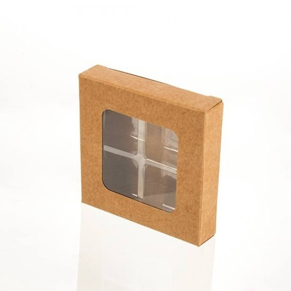 Diese Kraft Fensterschachteln mit transparentem Tray sind für 4 Bonbons/ Schokoladen oder Süßigkeiten entworfen. (Schokolade Einsatz 2,5 x 1,1 x 2,5 cm)