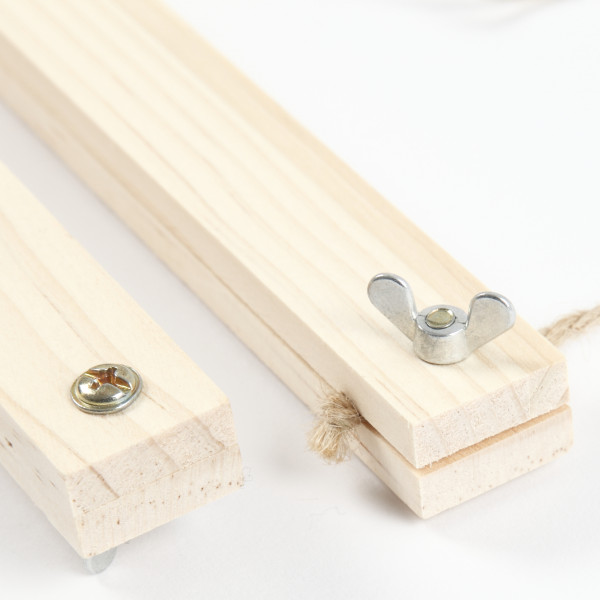 Set of poster lists in light wood consisting of 2 top and 2 bottom lists, respectively, in which the suspension is fixed by means of a wing shoe. Supplied with seperate suspension cord, which is fastened with a knot on the underside of the top strips.