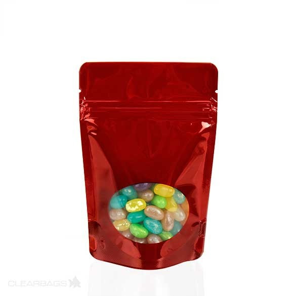Standbodenbeutel Rot 8x5x13cm | 28 Gramm mit ovalem Fenster (100 Stück) [ZBGO1R]