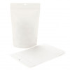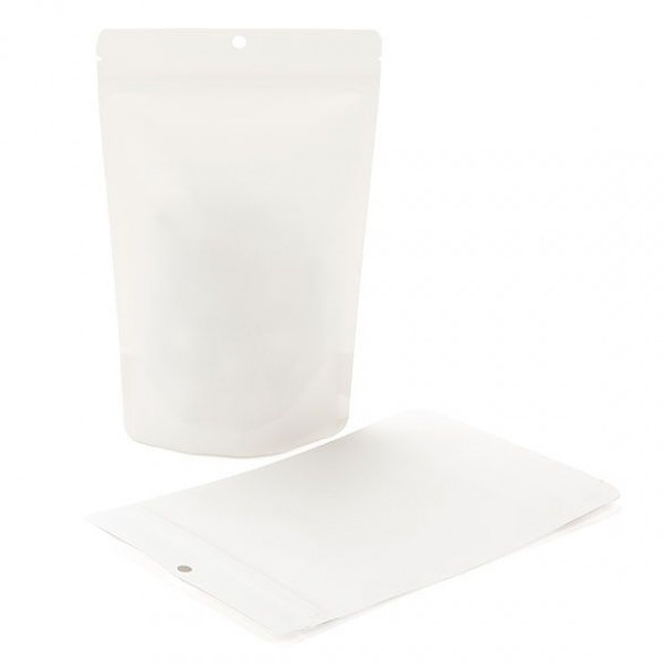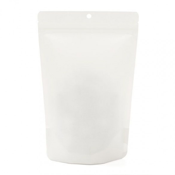 Our ZBGEK7W Stand Up Zipper Pouch in White Kraft offers a high barrier to keep products fresh. The ZBGEK7W measures 14.9 x 8.9 x 23.2 cm and is ideal for 312 g. Products like tea, powdered mixes, candy, grains, oats, cereal, and pet treats work well in this self-supporting pouch. The material is made of 65 gsm white kraft paper and has a laminated inner lining, made from plant-based PLA material and an ALOX protective coating. The pouch is designed with a resealable zipper, tear notches, and a round hand hole for retail. Heat seal for a secure closure.