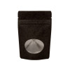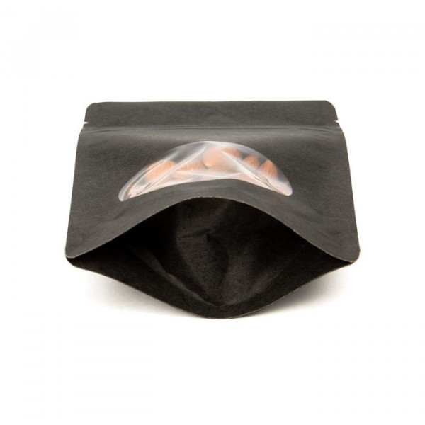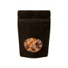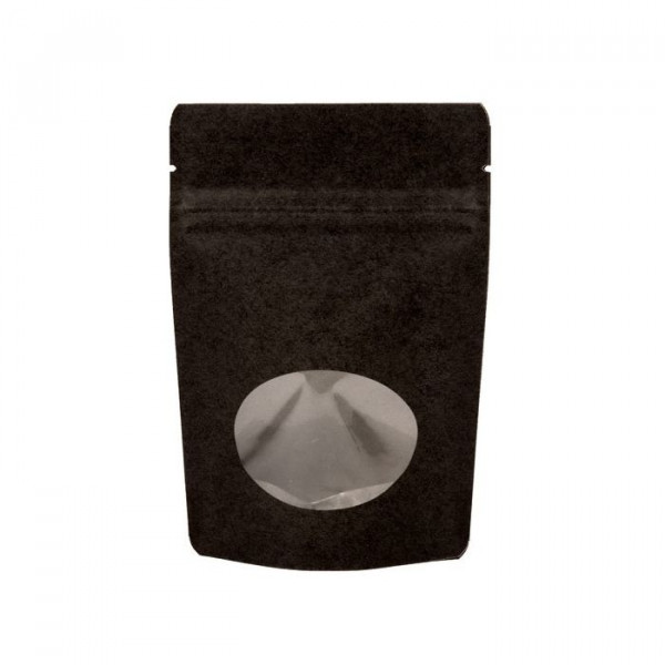 Make your products catch the eye of consumers on a retailer's shelf with this black kraft stand up zipper pouch. The natural kraft material is sure to draw attention and the clear oval window on the front of the pouch helps to immediately show off your product. This pouch has outer dimensions measuring 170 x 90 x 285mm and usable space measuring 160 x 75 x 250mm, which makes it ideal for holding products like cookies, popcorn, homemade treats, dog biscuits, baking mixes and more. ZBGO4BK features a built-in pouch design that allows it to stand on its own, a resealable zipper for freshness, and tear notches for easy access after being heat sealed.