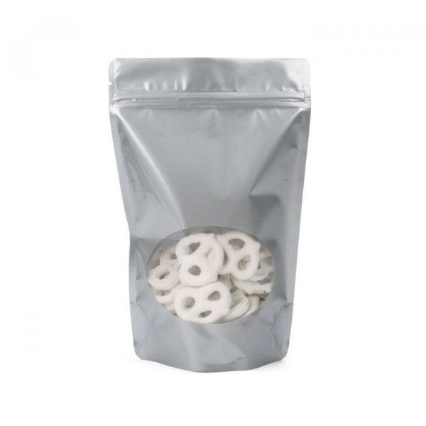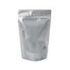 We offer a wide variety of zipper pouches for all of your packaging needs. This ZBGO7S is part of our line of Stand Up Pouches that feature a clear oval window to show off your product. This silver pouch measures 150 x 90 x 232mm and holds 312 g of dry goods. A resealable, airtight zipper will help keep products like popcorn, jerky, protein mixes and more fresh and safe from moisture. This pouch can be heat sealed with a standard hand sealer and features tear away notches for convenient access once sealed.