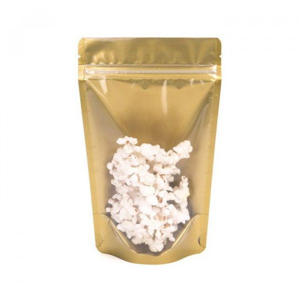 Stand Up Zipper Pouches look great on retail shelves filled with snacks, coffee, powdered mixes, and much more. ZBGGC3 is our 130 x 80 x 205mm Gold Stand Up Zipper Pouch designed with a clear front panel and gold interior. With a usable space of 120 x 65 x 170mm, these self-supporting pouches expand when filled and hold 4oz/113g. Package items like gourmet popcorn, pretzels, peanut brittle, and dried fruit. These pouches are 90 micron thick and provide high barrier protection to seal in unique and zesty flavors. A resealable zipper prolongs freshness after opening. Tear notches allow convenient access when heat sealed.