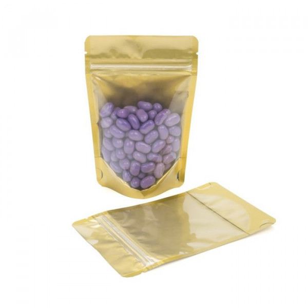 Create a high-end look on retail shelves with our ZBGGC7 Gold Backed Zipper Pouch Gusset Bag. A clear front panel provides full visibility of your product so customers can see the product before they buy. The gold printed interior panel provides a fancy package for pasta, rice, flavored snacks, chocolate, popcorn, mixes, and more. Measured at 150 x 90 x 232mm, this bag provides a usable space of 140 x 75 x 185mm and holds 6-11oz/170-312g. Standard features include an airtight, resealable zipper and easy tear notches. This pouch is 90 micron thick and is made with laminated material for added strength and barrier protection. When heat sealed, tear notches offer an easy opening. FDA approved for contact with food.