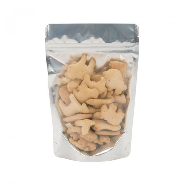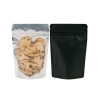 Our ZBGB3 Stand Up Zipper Pouches come in a black finish and have a clear front panel with a silver interior. These shiny pouches create a high-end look for fancy snacks and ordinary grains alike. At 130 x 80 x 205mm, these pouches have a usable space of 4 ounces/57 grams (based on whole coffee beans). A laminated blend of materials provides a durable package and built-in high barrier protection against moisture and odors. An airtight resealable zipper keeps flavors and aromas inside the bag. Ideal for coffee, spices, chips, jerky, and more. Tear notches are located above the zipper for easy access to your product. These pouches look great on retail shelves.